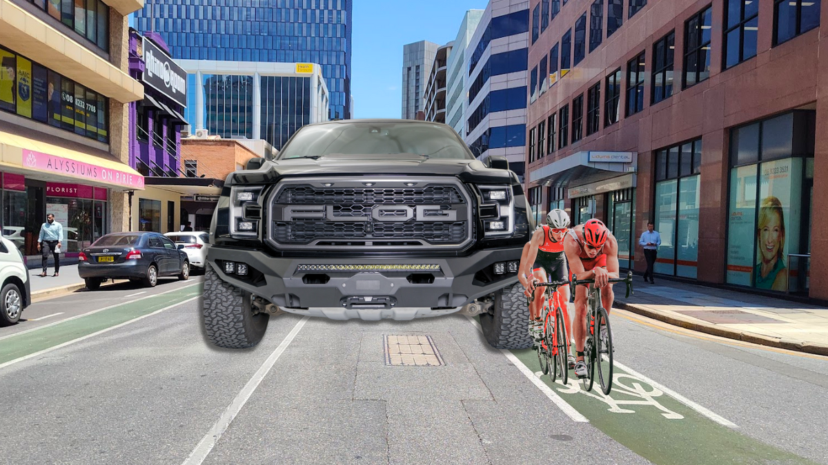 ‘Hate how much farken’ room these skinny lycra-wearing, latte-sipping yuppies are takin’ up on the roads hey?!’ yelled Skaifey umprompted from his four-metre wide, two-storey tall, lifted Ranger-Ram-Raptor-Cruiser-Silverado-Colorado-50-XL quad-cab Emotional Support Vehicle.