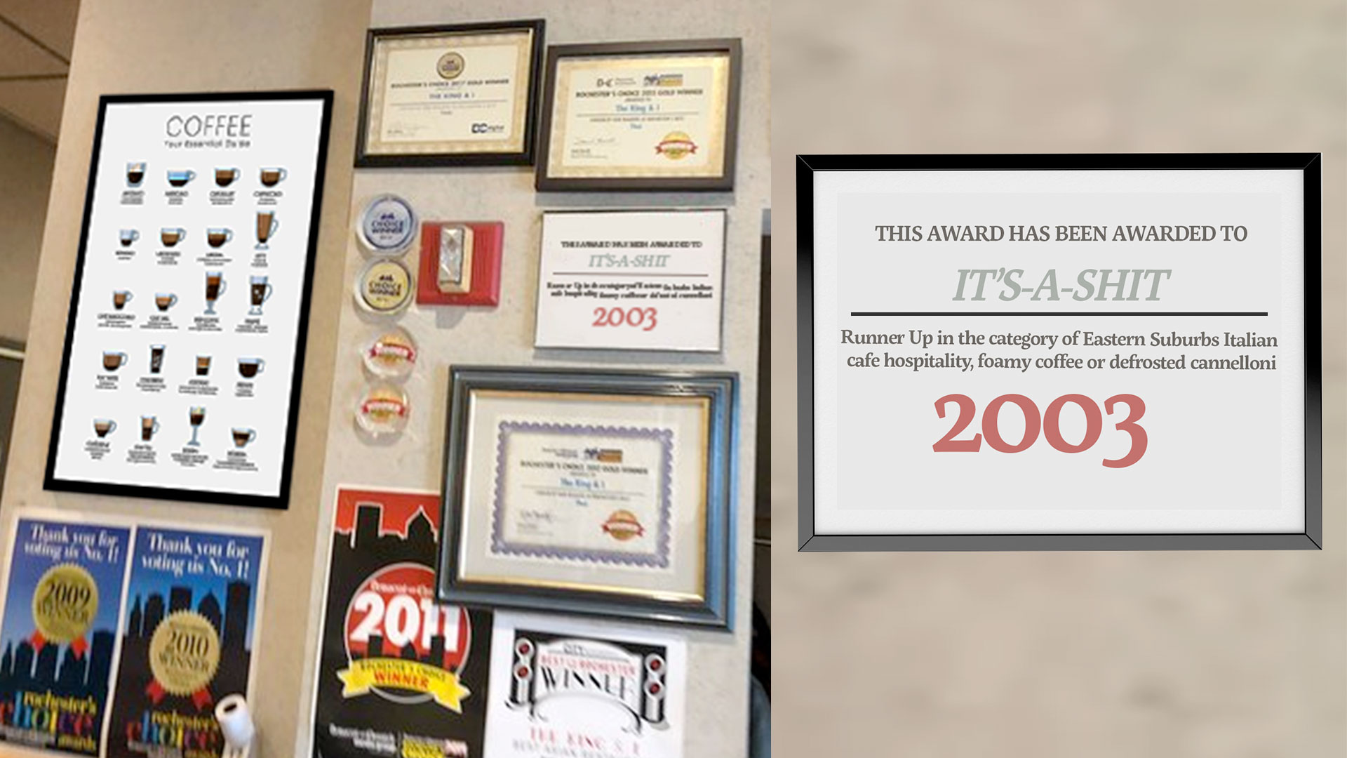 The cafe’s award for “Runner Up in the category of Eastern Suburbs Italian cafe hospitality, foamy coffee or defrosted cannelloni” was judged by a publication that has been out of print for over a decade.